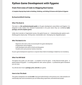 Whether you’re a complete beginner or a coder looking to level up your game dev skills, this guide breaks down complex concepts into easy, manageable steps. Build your confidence and creativity as you develop fun, interactive games from scratch!